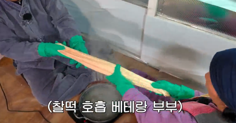 뜨거운 엿을 맞잡아 수십 번 늘리고 접는 과정에서 조금의 호흡만 어긋나도 실패로 이어지기 때문에, 오랜 세월 손발을 맞춘 부부의 호흡이 무엇보다 중요합니다.