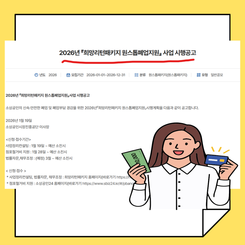 2026 소상공인 희망리턴패키지 신청 총정리 (원스톱폐업지원·지원금·교육·재창업·서류 안내)