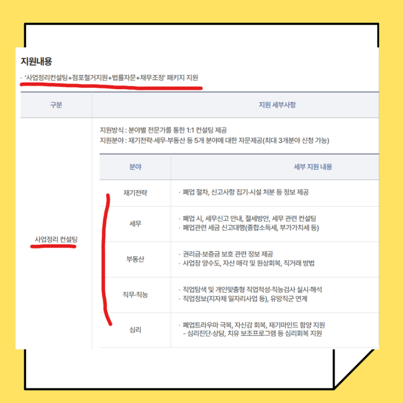 단순 폐업 보조금이 아니라, 폐업 준비부터 취업·재창업까지 단계별로 지원하는 패키지 사업이라는 점이 가장 큰 특징입니다.