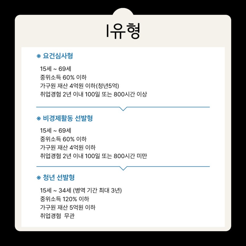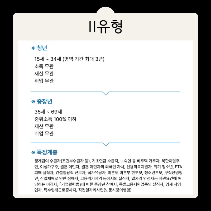 II유형은 소득이나 경력 요건이 I유형에 맞지 않는 사람도 취업지원 서비스를 받을 수 있는 유형입니다.
