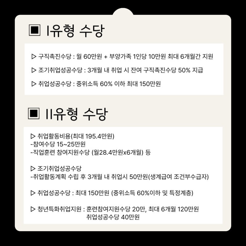 다만 I유형처럼 매월 60만원을 지급하는 구직촉진수당은 없습니다. 대신 취업활동비용, 취업성공수당 등이 지원됩니다.