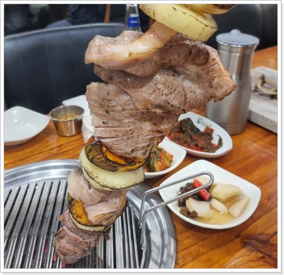 대표 메뉴인 대왕꼬치는 약 2.2kg의 압도적인 크기를 자랑하며, 살코기와 비계가 적절히 어우러져 씹을수록 깊은 풍미가 느껴집니다.
